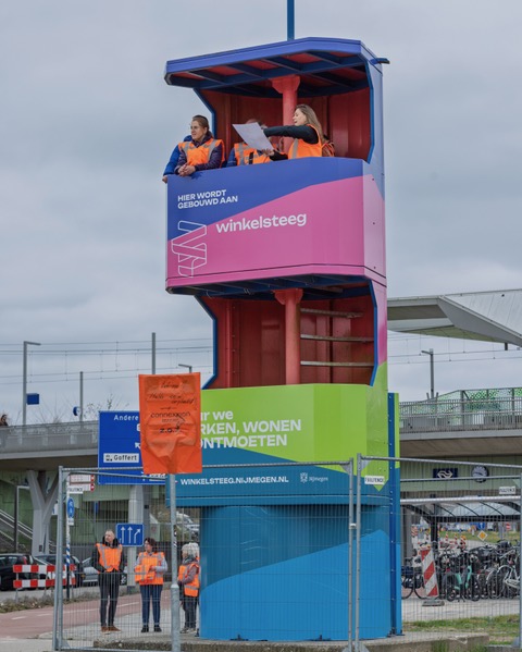 De ‘Gluren bij Winkelsteeg’-toren reist mee met de veranderingen in het gebied. Nu staat de toren in het gebied bij station Goffert. Daar wordt gewerkt aan drie nieuwe onderdoorgangen onder de wegen. Dit zijn veilige routes voor fietsers en voetgangers.